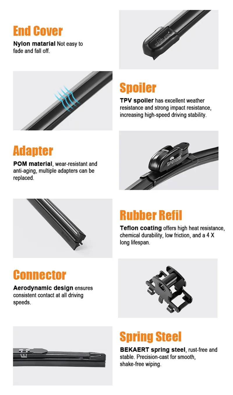 Alla plaster och gummin är inte lika. Vi använder importerat naturgummi med teflonbehandling för smidig och tyst avtorkning. Fjädrar är av högkvalitativt Bekaert-stål, värmebehandlade för konstant tryck. Hus och gavel är gjorda av PA66-förstärkt nylon, som motstår värme, fukt och slitage. Varje val är tänkt att förhindra de problem som distributörer ofta ser med billigare blad: ränder, gnisslor eller för tidigt fel.